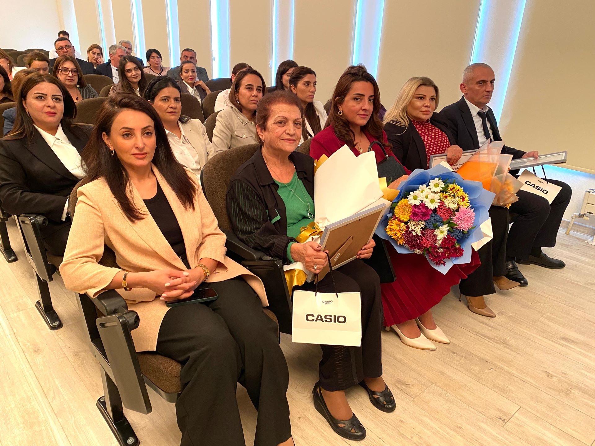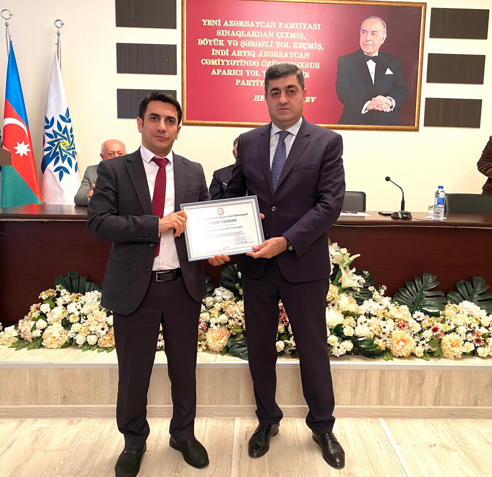 Sonra təhsilin inkişafindakı xidmətlərinə və rayonun ictimai həyatında fəal iştirakına görə fərqlənən bir qrup təhsil işçisinə Xəzər RİH başçısının və YAP Xəzər rayon təşkilatının Fəxri Fərman və hədiyyələri təqdim olunub. Tədbirin sonunda xatirə şəkili çəkilib.